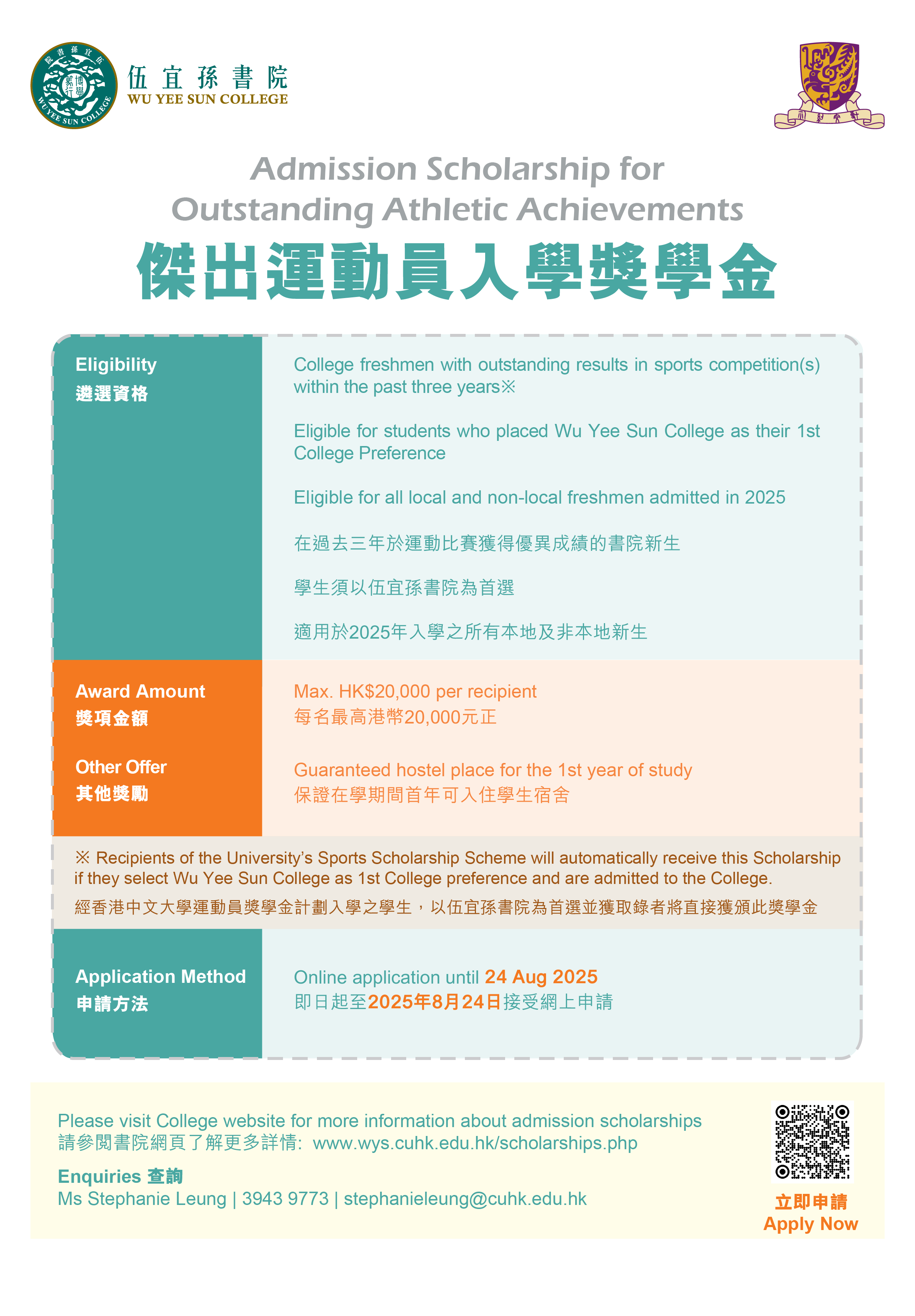 *Recipients of the University's Sports Scholarship Scheme will automatically receive this Scholarship if they select Wu Yee Sun College as 1st College preference and are admitted to Wu Yee Sun College.