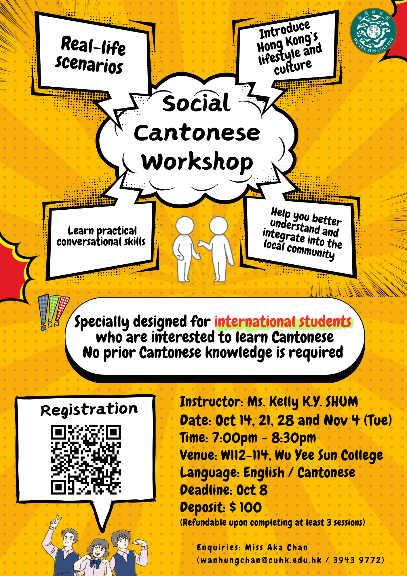 Social Cantonese Workshop is designed for international students who are interested in using Cantonese to communicate in daily life. Through real-life scenarios such as ordering food, dining out, shopping, taking public transportation, asking for directions, and making small talk, students will learn practical conversational skills to navigate everyday life in Hong Kong. The workshop also introduces elements of Hong Kong’s lifestyle and culture, helping students better understand and integrate into the local community. No prior Cantonese knowledge is required — just curiosity and a willingness to learn and have fun!